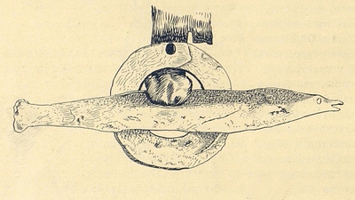 Ойбон у виде плоского обруча изображается с: >* Это раскрытый рот и глаз луо-дракона или Мирового Змея. Ранее я писал об этом в нашей рубрике. Ойбон таким образом символизирует мифическую змею, кусающую собственный хвост. Знак бесконечности. Визуализируется в виде стремительно вращающегося обруча. Это вход в позвоночный столб ойууна долоҕой «спинной мозг» и восхождение в Верхний мир (Будущее) в Уу Дьулай (темя шамана) или снисхождение в Нижний мир (Прошлое) в Уу Дьаамы (в якутском дьаамы понимается и как «низ брюха, чрева», а Уу Дьаамы — это гиблые воды в верхней части Нижнего мира) и далее в более глубокие слои Нижнего мира (ноги шамана).