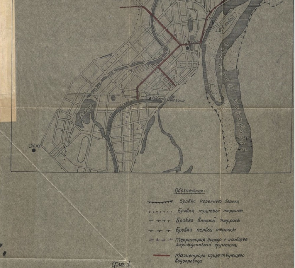 Далее индивидуальную (для меня) лекцию Октавия Несторовича мне удалось снять на видео: «В 1945 году над разведочно-эксплуатационной скважиной (вышка уже другая стояла) началось строительство здания насосной станции, монтаж водоподъемного оборудования и новой фильтровой колонны. Да. Практически на площади Орджоникидзе — получается, чуть в глубине от здания ЛОРП. Перед насосной станцией ближе к площади находилась контора горводопровода. А так эти работы по строительству и настройке насосной станции продолжались до конца 1946 года. В этот период мерзлотоведы наблюдали за гидрохимическим и уровенным режимом подмерзлотных вод и проводили работы по предотвращению замерзания воды. В 1947 г. скважина была сдана в эксплуатацию и начала снабжать население города подмерзлотной водой».