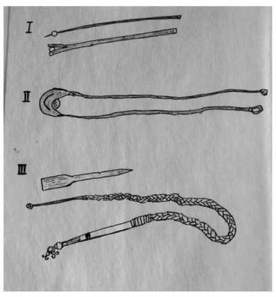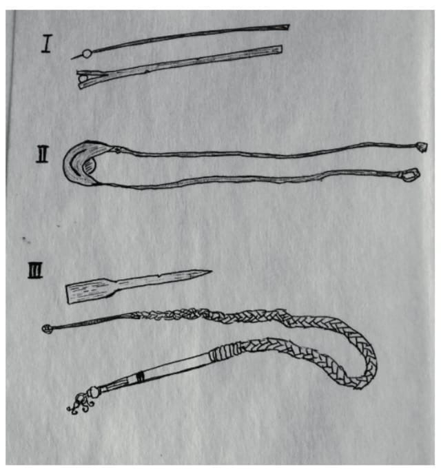 Похожий принцип применяли и в конструкции быыра кускуур. Плоская стрела с подпилом сбоку. Туда вставляли узелок кожаного ремешка на палке длиной в 80–90 см. Также обертывали ремешок вокруг быыра. Держали короткий дротик в левой руке, а плеть — в правой. Теперь стоило, используя поворот всего тела, хлестнуть плетью — и дротик вылетал так, что глаза не успевали уследить.