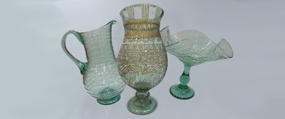 — Формы сосудов разные, стенки толстые, прозрачного темно-зеленого цвета. Некоторые вазы имеют волнистые борта, а графины — шнуровидные налепи. На фото на одном из графинов видна эта техника, когда на готовую форму во время остывания прикрепляли жгутик из жидкого стекла и спиралевидным образом вели наверх.