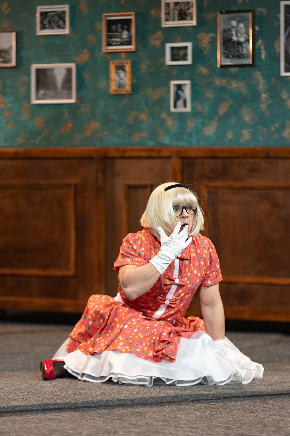 Роль Лео для Евгения Кузьмина, кажется, не составила труда: нечто похожее уже есть в его актерской копилке — герои комедий «Боинг-Боинг» и «Тёмная история». А вот его Лео в образе полуфранцуженки Максин великолепен. Его статная Максин забавно сутулится из-за высокого роста, манерно жестикулирует и говорит чуть более высоким голосом. В первом своем появлении она взволнована и испугана разоблачением, но с каждой минутой смелеет и в полной мере осваивается в новых обстоятельствах, задавая движение сюжету и чаще всего владея сценой. Он легко переключается с Лео на Максин и обратно и совершенно очаровательно влюбляется в Мэг.