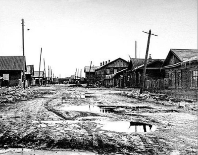 Фото из архива А. Т. Кондакова. Запечатлен вид на ул. Пушкина В двухэтажке справа жили цыгане, чуть ближе в маленьком доме и находился старый ЗАГС