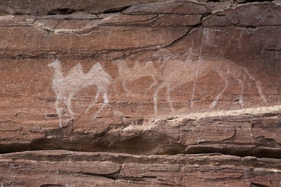 Изображение всадника со знаменем и верблюды. Шишкинские писаницы, верховья реки Лены