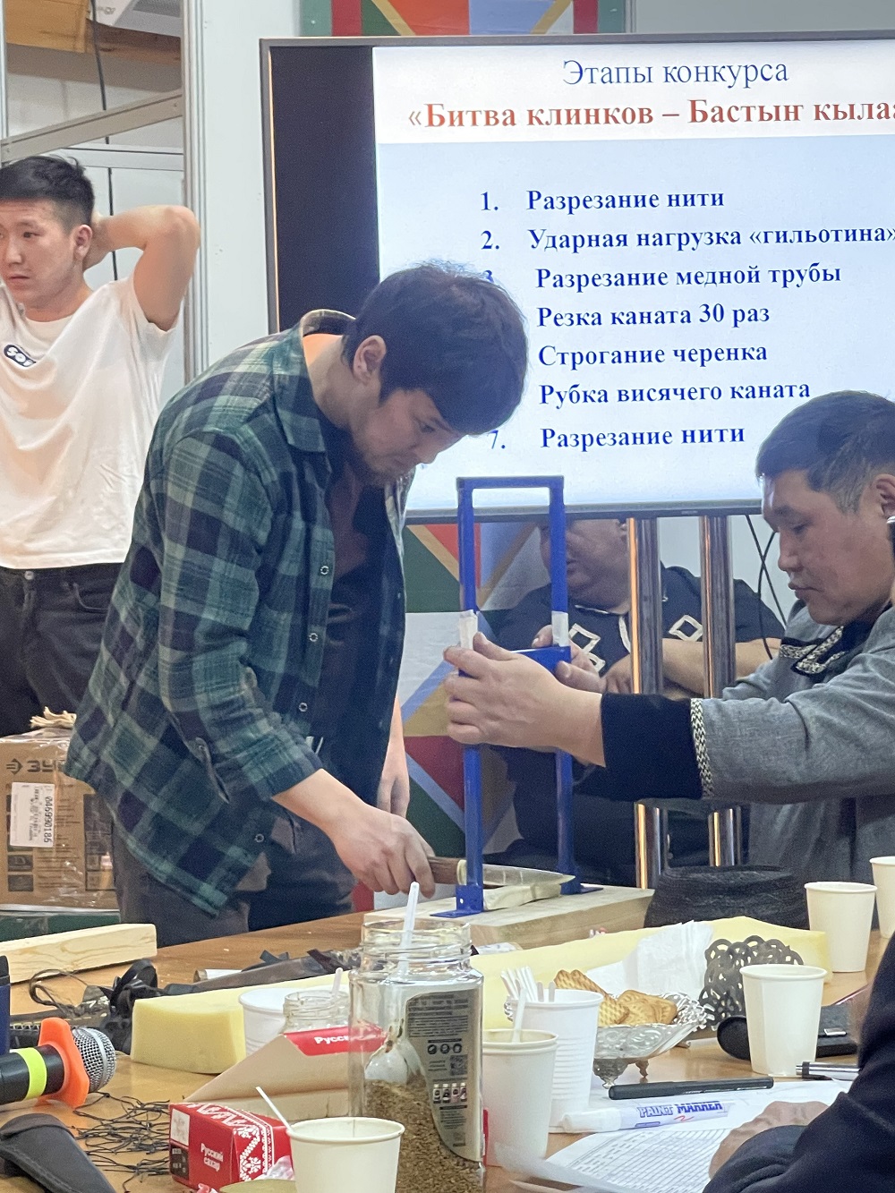 Конкурсантам предстояло пройти несколько этапов. Сначала ножом разрезали нити. Затем клинок тестировали на прочность на специальном приборе — ударная нагрузка на «гильотине». После чего проверяли сталь на твердость и упругость на дереве. Втыкали, били по рукояти, с усилием сгибали клинок, после чего он должен был полностью восстановить форму. На этом этапе не все ножи выдерживали тест. По нашим подсчётам, четыре ножа в тот день выбыли из конкурса из-за сломанного острия или сколов. У одного участника, к примеру, клинок полностью отделился от рукояти.