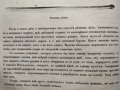 В материале про якутские палаши долоҕодоһун (имеющие параллели с тибетским палашом-дпадам) мы упоминали тутуука. Долоҕодоһун заточен с одного ребра и имеет у кончика клинка односторонний округлый спуск. Тутуука же описывается как абсолютно прямоугольный клинок — «заточенная с одного ребра удлиненная железная доска». Эвенки называли этот вид оружия тутэкэ — отсюда и происходит якутский термин. Отличительная черта тутэкэ — прямые углы на кончике клинка. Были притом моо тутэкэ «деревянный прямоугольный меч» и сэлэмэ тутэкэ «железный прямоугольный меч». Деревянные тутэкэ выстругивали из доски завозной (из Амура и Уссурии) каменной березы. Ближайший их аналог — негидальские деревянные мечи мукэчи и искусство владения ими в ближнем бою, описанные еще А. Ф. Миддендорфом. Мукэчи тоже выстругивали из каменной березы. Однако они имели вид, схожий с японским деревянным мечом бокэн, лишь угол изгиба был меньше.