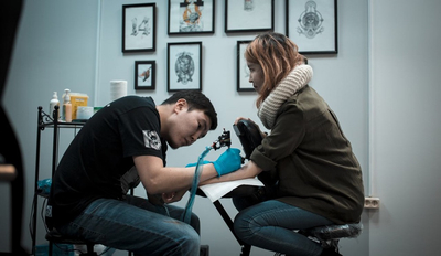 — Это был 2014 год. Да, ни разу. Я, помимо работы, не прекращал рисовать, копились тетради с моими картинками, но про тату особо и не думал. Даже в Китае, когда приставал к тату-мастеру, это в целом было не всерьез, так, ради поддержания разговора. И вот однажды ко мне в гости зашла знакомая, похвасталась только что набитым тату. Тату было хорошее, а она, разглядывая мои рисунки, сказала, что эти ребята ищут ученика. Я подумал: «Почему бы и нет?». Решил попробовать. Там посмотрели на мои рисунки и сказали: «Вообще-то, мы уже взяли одного чувака в качестве ученика... Но он хуже тебя, его выпинываем, тебя берем!» Условия такие: месяц ничего не делаешь, только смотришь, как работают другие. Я такой: «Классно!» Но испытательный месяц я не прошел, ушел, так и не подержав тату-машинку в руках...