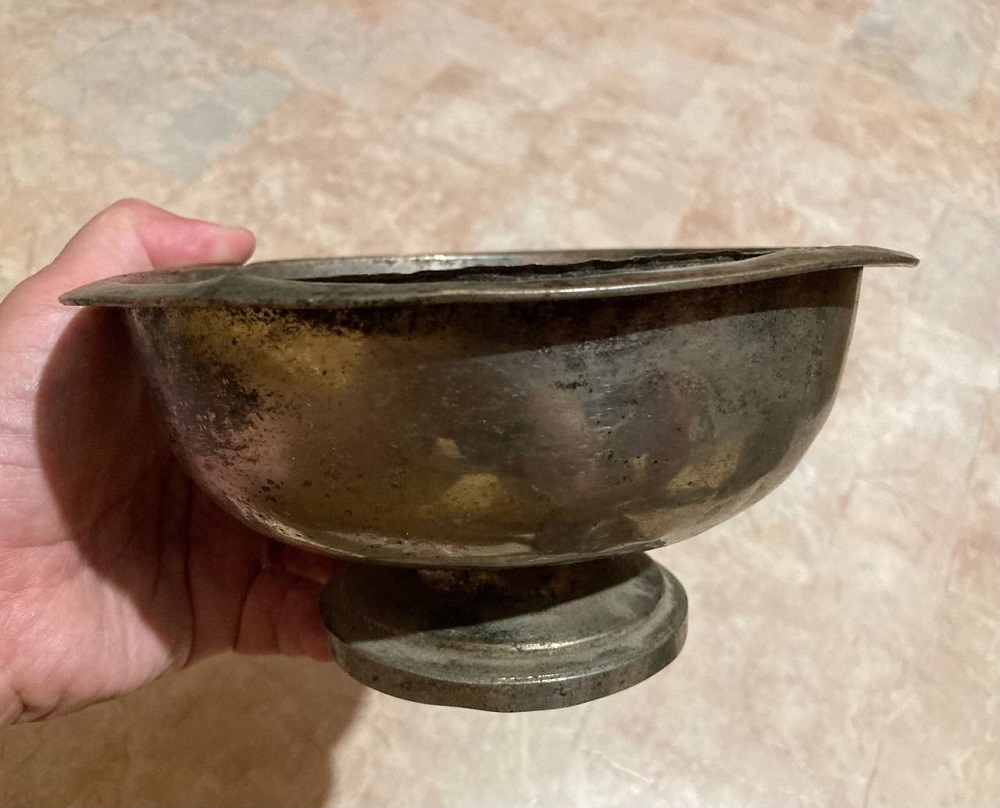 Сосуд для даров шаманским духам на Чукул из обыкновенной дореволюционной самоварной капельницы. Клеймо знаменитых производителей самоваров «Аленчиковъ и Зиминъ».
