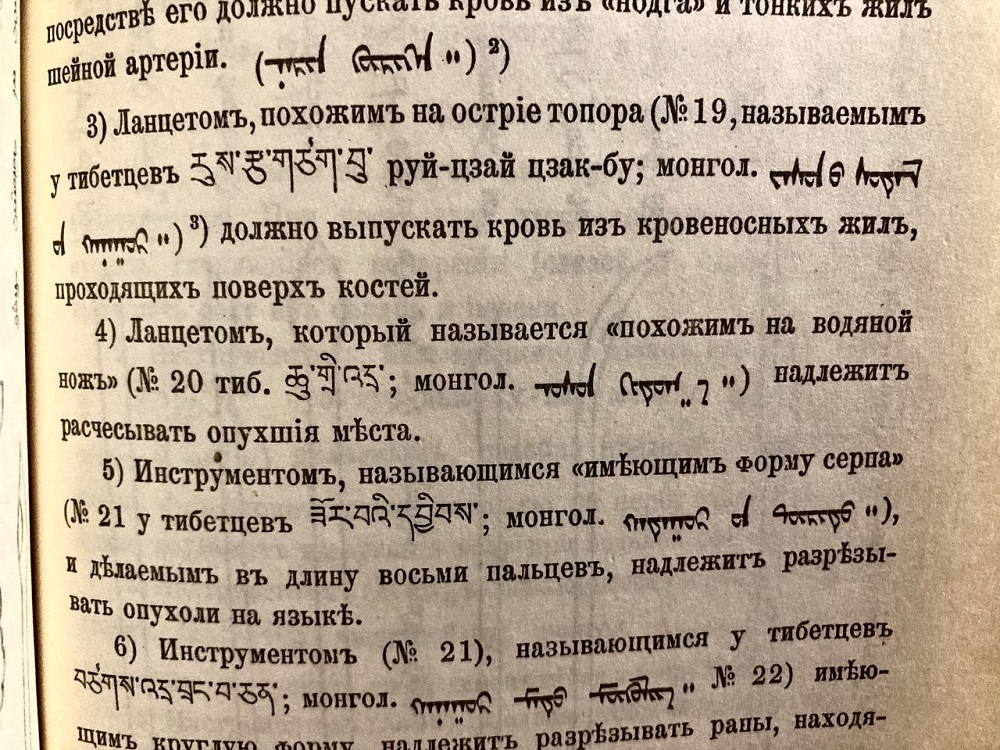 Специалист по тибетской медицине Д. Б. Дашиев отмечает любопытный факт: «Полностью совпадает описание якутского ланцета для кровопускания в виде миниатюрного топорика с тибетским инструментом sta-re, который используется для тех же целей».