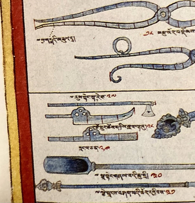 В середине — ланцет «лезвие топора». 34-й лист тибетского медицинского трактата «Вайдурья онбо» («Голубой берилл»).