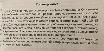 — Да. Тот самый! Однако мне привычнее название «хаанньыт сүгэнньигэ» — топорик знахаря для кровопускания (подрезали вены), сбривания неопасных новообразований, для размягчения окостеневших сухожилий (разбивали и размягчали несильными ударами обушком). Могли и при ампутации отмирающих пальцев применить. Использовался и при хирургических вмешательствах (например, пулю достать или наконечник стрелы, засевший в плоти). Проводили также полостные операции коровам (при вздувании живота, непроходимости кишок). Еще одна функция, чисто удаганская — изгнание и разрубание болезнетворных злых духов и показ фокусов в виде отрубания собственных пальцев и приращения обратно. Но главное — это подрезание вен для кровопускания. Резали, накрывали пустотелым коровьим роговым кожухом, путем высасывания ртом воздуха из полости рога вызывали вакуум, закрывали пробкой отверстие на кончике рога — набрав таким образом «черную (вредную, болезненную) кровь», сливали ее. Повторяли забор крови несколько раз, «пока кровь не очистится». Про все это я слышал шапочно, конечно, но из уст старых еще знатоков.