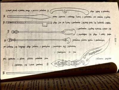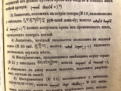 № 19 — тибетский железный ланцет sta-re в виде топорика, используемый для кровопускания из сосудов, расположенных над костями. Из дореволюционного издания учебника тибетской медицины «Чжуд-ши».