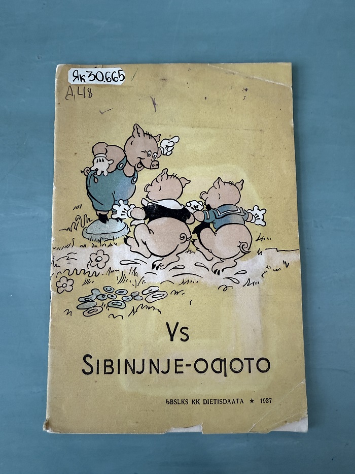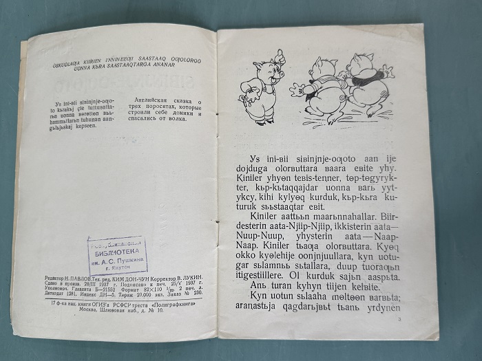 Издание подписано к печати 25 мая 1937 года. Это самый разгар периода «латинизации» якутской письменности. Также мы понимаем, что Георгий Васильев перевел «Трёх поросят», обучаясь в институте. А ведь книга вышла в главном детском издательстве страны. Это значит, что перевод студента Васильева прошел строгую редактуру и был признан эталонным для детей Якутской АССР.