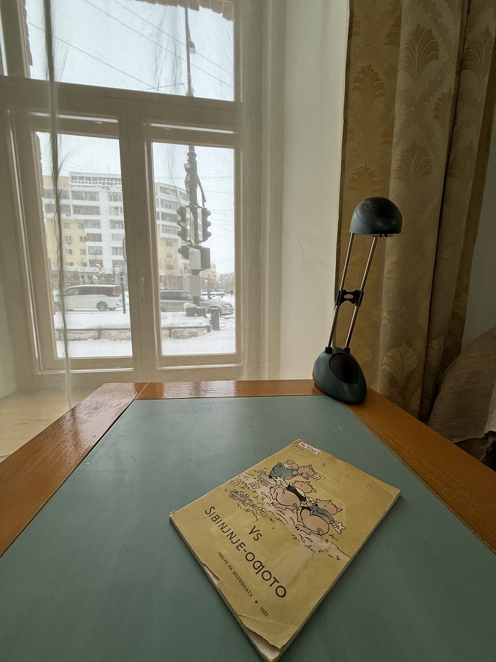 В первый раз мы увидели эту книгу на снимках, сделанных зимой в Музее дружбы народов им. Ксенофонта Уткина в Нюрбе. К сожалению, сотрудники музея не смогли нам рассказать, как и когда она к ним попала. Издание было довольно потрепанное, так что хранители фонда не дают его посетителям, разрешая только сфотографировать. Любопытно представить, как дети представителей якутской интеллигенции читали эту книжицу, передавая друг другу, правда?