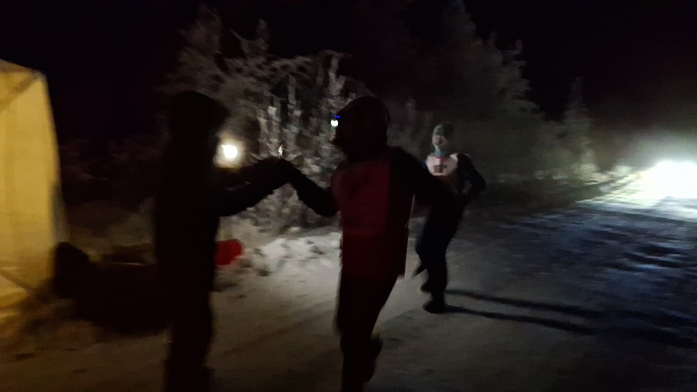 Так что на этой трассе пункты питания — это отапливаемые брезентовые палатки, где участник может выпить горячего чаю или супа. Пунктов всего семь, через каждые семь километров дистанции. Внутри горит "буржуйка", но полог практически не закрывается, марафонцы заходят каждую минуту. Так что "отапливаемый" не значит теплый — в палатках примерно -20 °С. Что, наверное, хорошо, потому что плюсовая температура может дать негативный эффект — весь иней, наросший на бегуне, растает и во время бега превратится в ледяной панцирь, сковывающий движение. Впрочем, лед под первым верхним слоем образуется в любом случае.